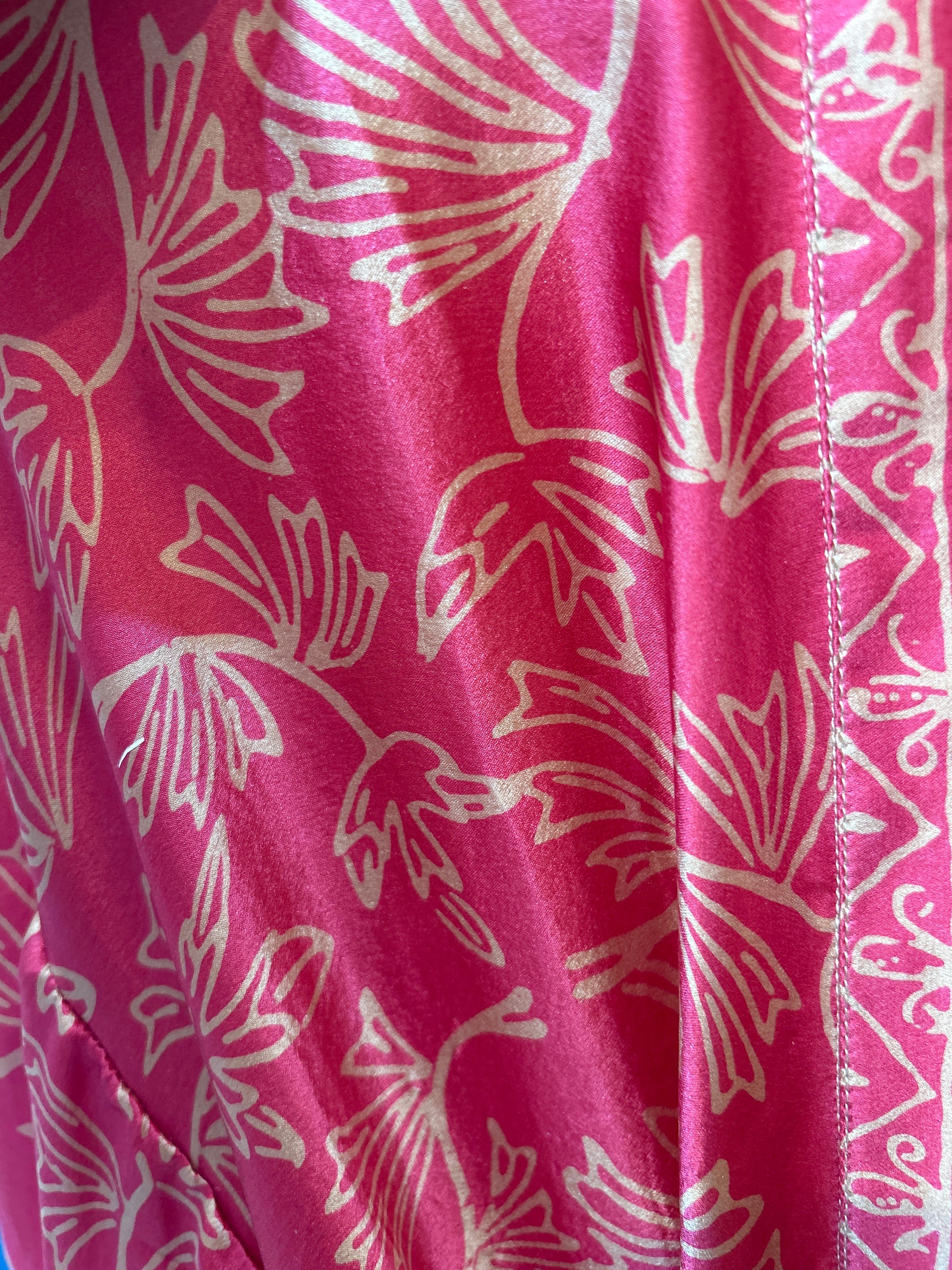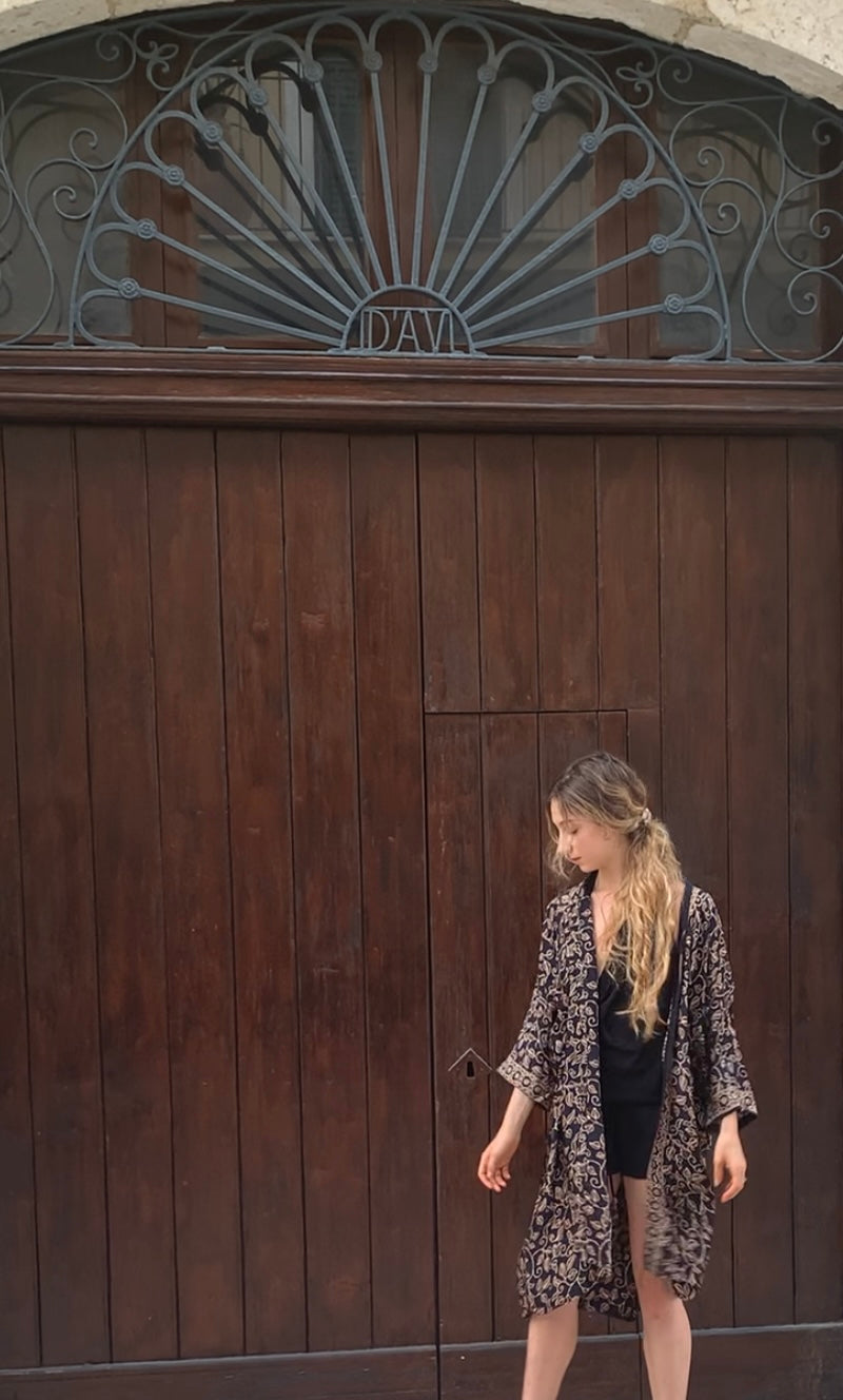 Handmade from 100% silk and hand-printed in traditional batik, this one-size short kimono floats with a liquid drape and relaxed silhouette. Lightweight and breathable, it layers beautifully over dresses, swimsuits, or jeans for an instant Mediterranean polish.