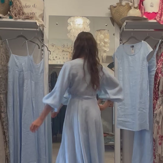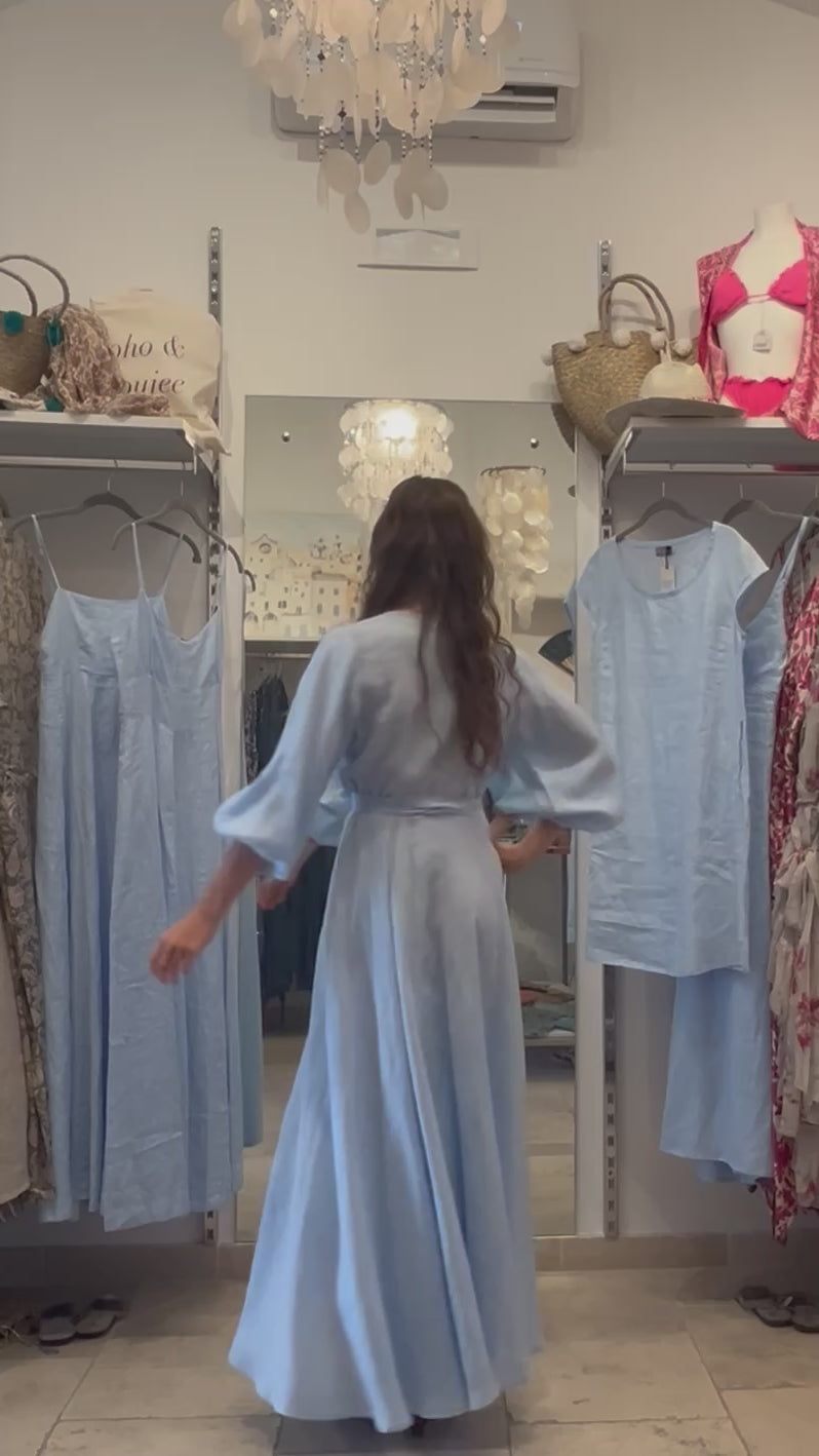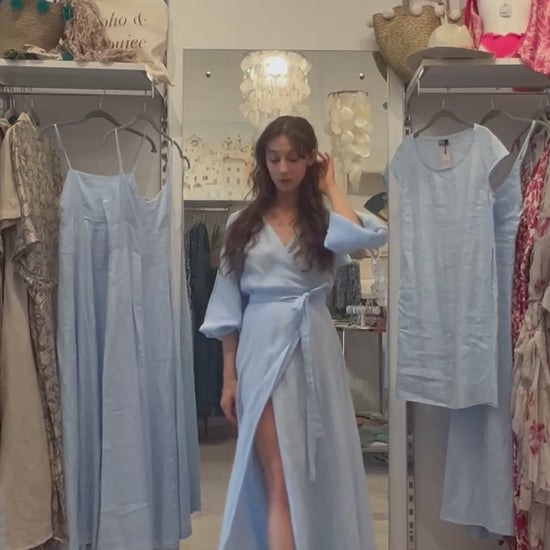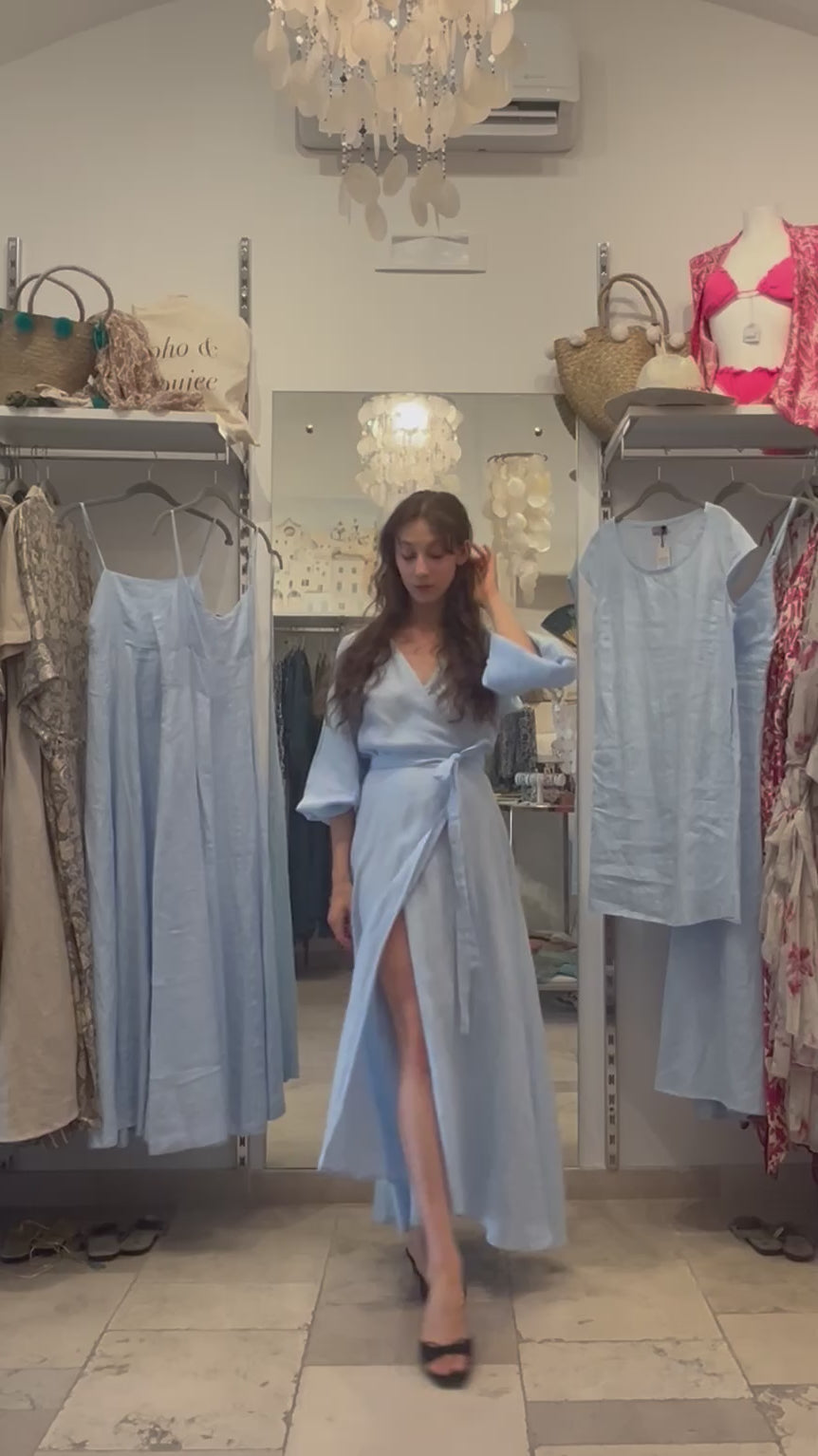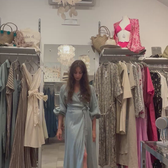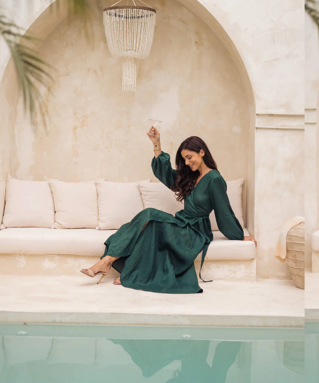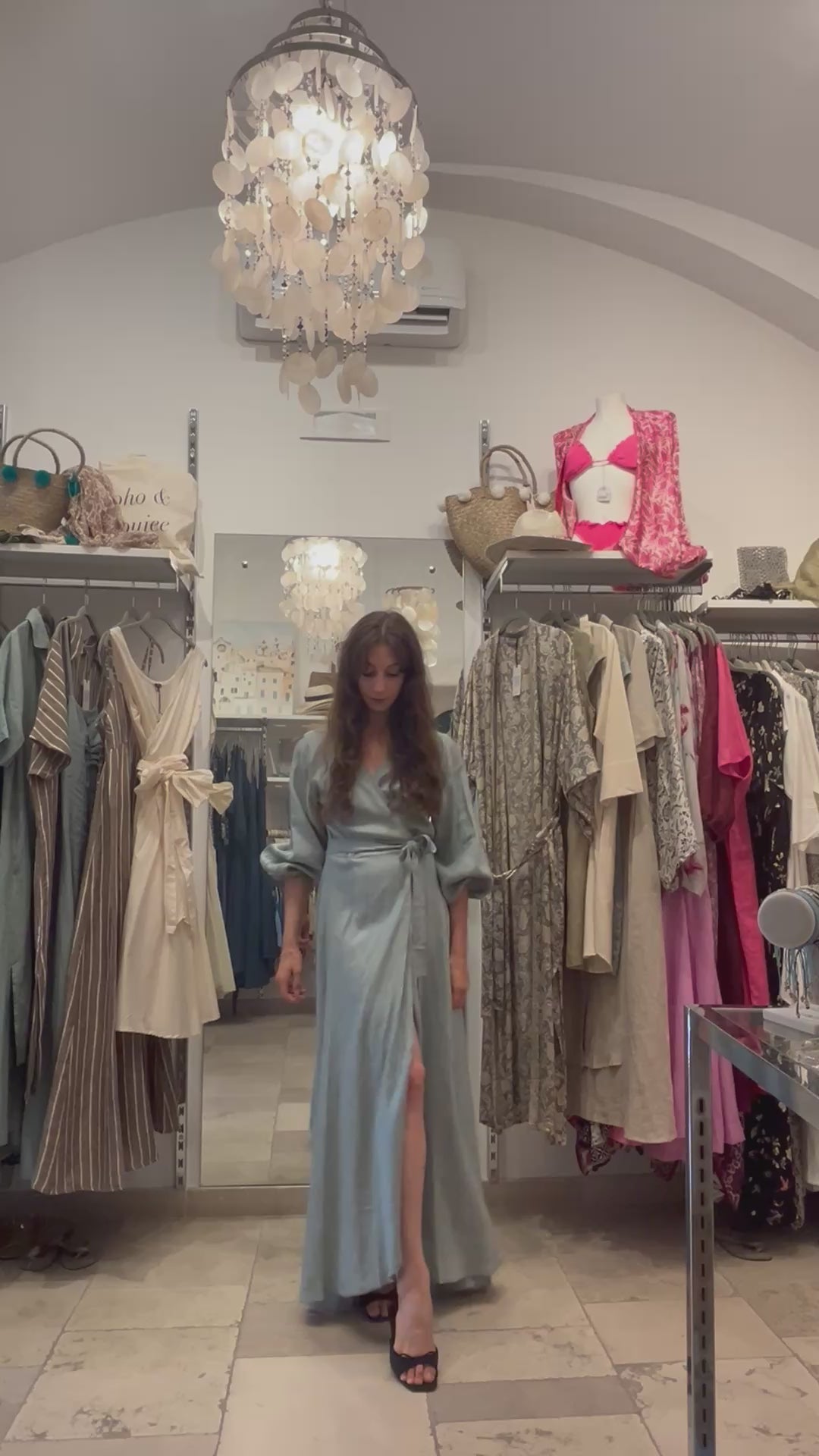Our Long Linen Wrap Dress is cut from 100% handwoven linen and finished with a flattering wrap waist and soft sleeves for daytime ease and evening polish. The ankle-grazing length and fluid drape make it an ideal travel and resort piece — lightweight, breathable, and artisan-made in small batches.